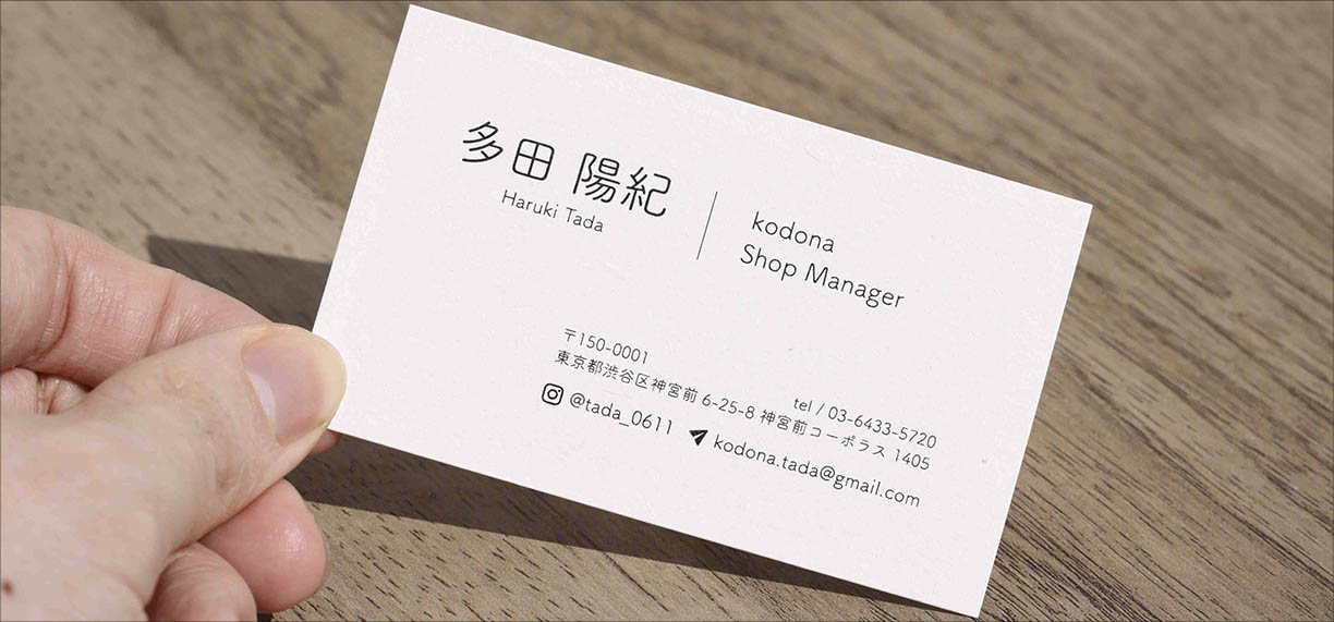 ヴィンテージセレクトショップkodonaのShop Manager多田陽紀さんの名刺のデザインから発注までの制作しました。文字、用紙選びと印刷業者の手配とkodonaの雰囲気に合わせたシンプルで見やすいデザインが特徴になっております。用紙には柔らかい印象になるようにバフン紙を使用しており厚みを出すことにより重厚感を出しております。フォントも同じく柔らかく優しいイメージになるように筑紫A丸ゴシックを使用しました。